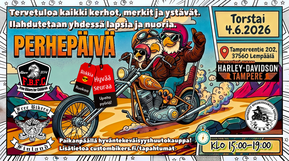 Tervetuloa CBF Perhepäivään! Custom Bikers Finland ja Harley-Davidson Tampere toivottavat lämpimästi tervetulleeksi kaikki moottoripyöräilyn ystävät viettämään iloista ja lämminhenkistä perhepäivää.…